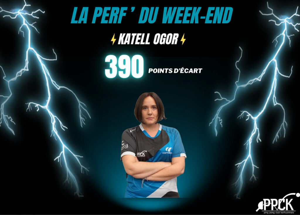 Après une pause pour blessure 🤕, elle est de retour et décroche la perf’ du week-end 🏆. Toutes nos félicitations, à notre championne de France Vétérans, Katell, qui s’adjuge la perf’ du week-end avec un succès à 3️⃣9️⃣0️⃣ points d’écart 🏓👍.